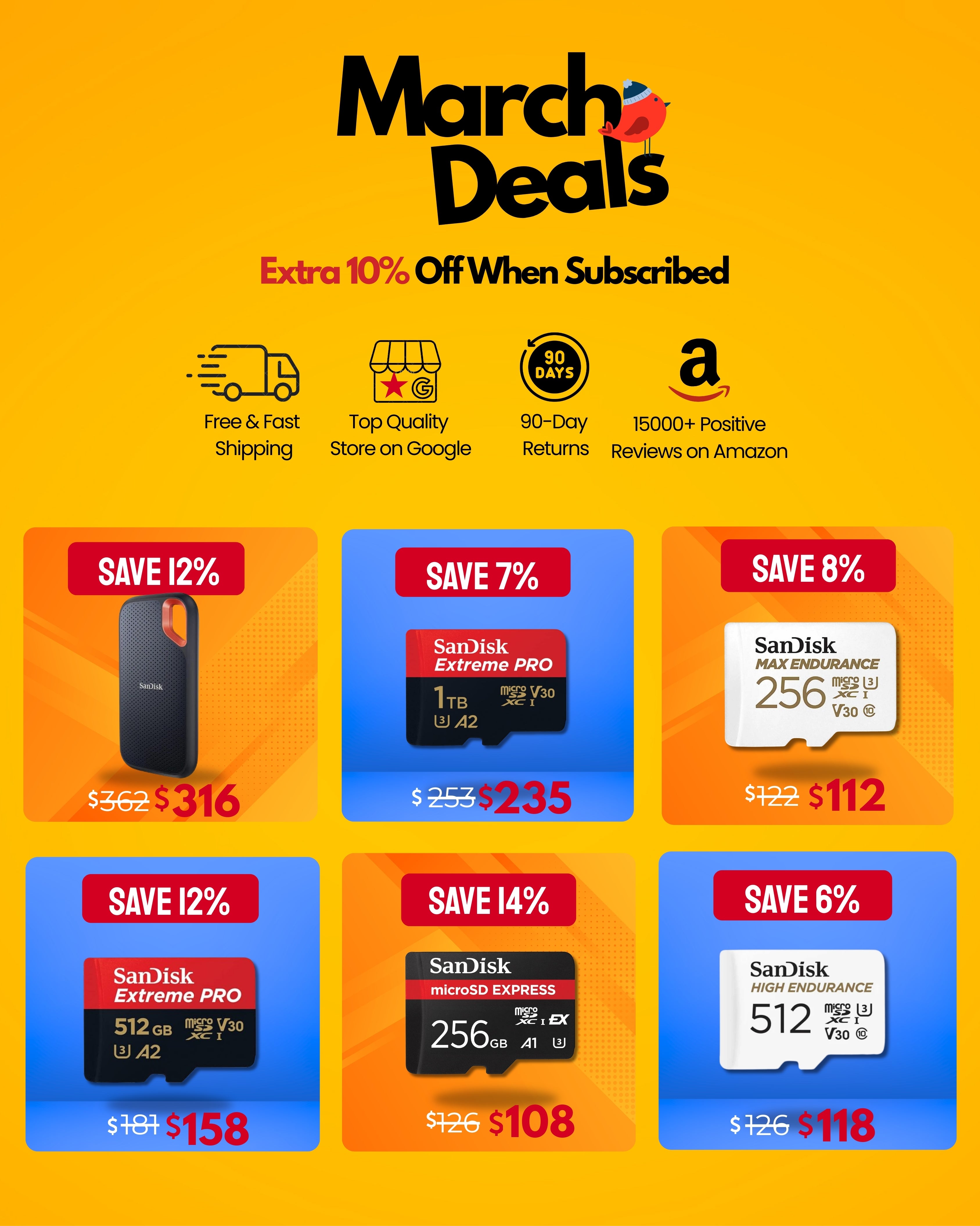Store offers fast, reliable shipping with genuine tech products including memory cards, storage devices, smart home items, and peripherals. Customers praise quality, compatibility, and value. Products perform well across cameras, phones, gaming consoles, and s... Store offers fast, reliable shipping with genuine tech products including memory cards, storage devices, smart home items, and peripherals. Customers praise quality, compatibility, and value. Products perform well across cameras, phones, gaming consoles, and smart home systems. Most report excellent speeds and durability, though some note occasional failures or slower performance than expected.